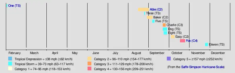 The 1952 Atlantic hurricane season was the last Atlantic hurricane season in which tropical cyclones were named using the Joint Army/Navy Phonetic Alphabet. It was a near normal Atlantic hurricane season, although it was the least active since 1946.[1] The season officially started on June 15;[2] however, a pre-season unnamed storm formed on Groundhog Day, becoming the only storm on record in the month of February. The other six tropical cyclones were named using the Joint Army/Navy Phonetic Alphabet, the first of which formed on August 18. The final storm of the season dissipated on October 28, two and a half weeks before the season officially ended on November 15.[3]