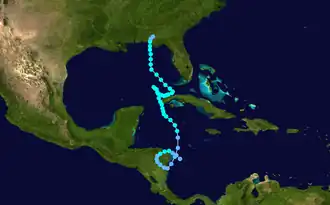 A tropical storm developed east of Nicaragua on May 25, executing a counterclockwise loop over Central America. After weakening over land, Alice re-intensified over the western Caribbean, moving over western Cuba on May 21 with winds of 50 mph (80 km/h). On June 1, it entered the Gulf of Mexico, and later executed another loop off the northwest coast of Cuba.[3] Alice quickly weakened due to a cold front,[4] and advisories were discontinued by June 3.[5] While near Cuba, Alice produced drought-breaking rainfall that caused flooding and several unofficial drowning deaths.[3]