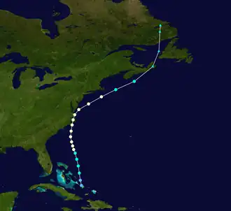 On October 3, a tropical storm developed near the southern coast of Cuba. It moved northwestward, crossing the island before turning to the northeast. Early on October 5, the storm brushed southeastern Florida,[8] producing gusty winds and rainfall. The threat of the storm prompted small craft warnings from the Florida Keys through South Carolina.[33] As it accelerated northeastward, the storm strengthened slightly to maximum sustained winds of 45 mph (75 km/h), before becoming extratropical on October 6. Two days later, the remnants moved over Atlantic Canada with winds of 70 mph (120 km/h),[8] producing flooding rainfall that washed out several roads. The storm caused two deaths after it wrecked a boat in Broad Cove, Nova Scotia.[34] Later, the cyclone passed south of Greenland before dissipating southwest of Iceland on October 10.[8]