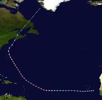 Shortly behind Dolly, another tropical wave spawned a tropical depression over the Lesser Antilles on September 15.[3] As it moved through the region, it produced unsettled conditions across the northeast Caribbean.[24] Edna quickly intensified as it tracked northwestward, attaining hurricane status on September 15 and peak winds of 115 mph (185 km/h) the next day. After peaking, the hurricane turned to the northeast and maintained most of its intensity for a few days.[3] It passed just north of Bermuda early on September 18 with winds of 115 mph (185 km/h), before beginning a steady weakening trend as it accelerated. By September 19, Edna completed the transition into an extratropical cyclone, lasting another day before dissipating west of Ireland.[8]