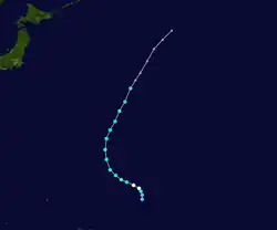 On July 23, Lola spawned southeast of Japan. The typhoon curved northwest before differing between north and west. The storm then drifted north before curving northeast and dissipating shortly after on August 3.[9]