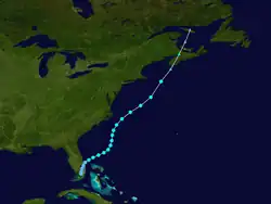 A trough formed over southern Florida on June 17. Early the next day, a circulation formed, signaling that a tropical depression also developed over the Everglades. The system moved slowly north-northeastward, emerging into the western Atlantic Ocean at 06:00 UTC on June 20. Shortly thereafter, the depression intensified into a tropical storm, although the structure was broad and asymmetric due to association with a nearby upper-level low, signaling that the system was possibly a subtropical cyclone. Ship reports in the region indicate that the storm continued to intensify. On June 22, the structure became much more symmetrical while passing just off the Outer Banks, bringing winds of 33 mph (53 km/h) to Wilmington, North Carolina. That day, the Hurricane Hunters estimated winds of 80 mph (130 km/h), and is possible that the storm briefly attained hurricane status. The peak winds were estimated at 70 mph (110 km/h), due to a pressure reading of 994 mbar (29.4 inHg). The storm accelerated northeastward due to an approaching cold front. On June 24, the storm became extratropical, and shortly thereafter made landfall along southwestern Nova Scotia. The system dissipated the next day over the northern Gulf of Saint Lawrence.[11]