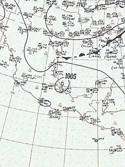 A low pressure area was present north of the Yucatán Peninsula on September 14. Nearby ship observations indicated that a tropical depression developed the next day in the central Gulf of Mexico, although the system's large structure meant it could have been a subtropical cyclone. The system moved slowly westward, bringing winds of 30 mph (48 km/h) to the coast of Louisiana. It is estimated that the storm reached peak winds of 45 mph (72 km/h) on September 16, based on reports from ships and the Hurricane Hunters. On the next day, the system began weakening over water, dissipating on September 18 without moving ashore.[11]