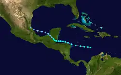 On September 24, Tropical Storm Gilda developed in the central Caribbean Sea about halfway between Jamaica and Colombia. A small storm, it moved westward throughout its duration. On September 26, Gilda attained peak winds of 70 mph (110 km/h) while nearing northeastern Honduras. The storm paralleled the coastline a short distance offshore, maintaining its intensity before hitting and later weakening over Belize on September 27. It re-emerged in the Gulf of Mexico before making another landfall near Tampico as a tropical depression on September 29, dissipating the next day.[4][6]