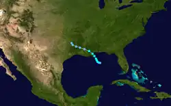 A weak disturbance was first observed near Grand Cayman on August 23.[4] The disturbance moved northeastward into the Gulf of Mexico, where it became a tropical depression late on August 25. Early the next day, the depression intensified into a tropical storm. The tropical storm marginally strengthened further, peaking with maximum sustained winds of 45 mph (72 km/h) by 0000 UTC on August 27. Nearing the Gulf Coast of the United States, the system curved towards the west.[7] The storm maintained its intensity up until landfall in Louisiana near New Orleans about four hours later.[4] Moving inland, it slowly weakened while crossing the Central United States, degenerating to tropical depression strength by August 28 and dissipating over east-central Texas several hours later.[7]