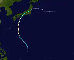 Typhoon June existed from September 20 to September 22. Its track was somewhat similar to Hurricane Patsy in the 1959 Pacific hurricane season.