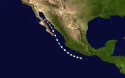 Estelle formed on August 29 south-southwest of Guatemala. The storm moved west-northwest, paralleling the coast of Mexico as an 85 mph (135 km/h) hurricane before becoming extratropical on September 9.[2] The remnants of Estelle brought heavy rainfall across southern California with rainfall totals reaching 3.1 inches (76.2 mm) in Julian.[7]