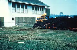 The next day, the lava threatened the town of Kapoho, which until then had been relatively unaffected by the eruption due to its slightly elevated location.[6] The flow, which had reached the gates of the village, began to enter the town as a result of the collapse of the southern flank of the slag cone, which had discharged large quantities of lava in the direction of the houses. The lava front flowing into the Pacific Ocean also changed direction as it moved towards Cape Kumukahi, causing the flow to move southwards along its entire length. This threatened the homes and schools of Kapoho, as well as the Kapoho Beach district further south.[6] An initial dike between Kapoho and the Puʻu Kukae volcanic cone was built between January 19 and 20. Measuring between 4.5 and 6 meters high, it was poorly located, rising between 6 and 12 meters below the natural threshold between Puʻu Kukae and the Kapoho crater. This dike was thus submerged by the six-meter-thick lava flow on January 23 at 3:30 pm. The same day, in the hamlet of Koaʻe to the north of Kapoho, on the other side of the flow, five buildings, including a church, were destroyed by the lava after several days of very slow advance. No dyke was built to stop the lava, which stopped advancing on January 28.[6]