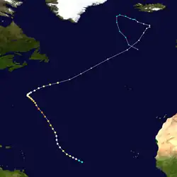 Tracking to the northwest, Frances made landfall near Punta Cana, Dominican Republic, early on October 3 with winds of 60 mph (97 km/h). No impact was reported on the island. Later on October 3, Frances emerged into the Atlantic Ocean just southeast of the Turks and Caicos Islands. Thereafter, the storm accelerated somewhat and resumed intensification, reaching hurricane status on October 4. Around that time, it curved northeastward and deepened further. Early on October 7, Frances attained its peak intensity with winds of 130 mph (210 km/h) and a minimum barometric pressure of 948 mbar (28.0 inHg).[3] The storm passed by Bermuda around that time, where it dropped 1.35 inches (34 mm) of precipitation.[38] Later on October 7, Frances re-curved to the north. Early on the following day, the storm became extratropical as it approached the Gulf of Maine. The remnants curved east-northeastward and struck Nova Scotia, before dissipating early on October 10.[3]