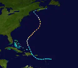 | Six | September 12 – 15 | Tropical storm | 65 (100) | 996 | The Bahamas, East Coast of the United States, Atlantic Canada | Minimal | None | |||
