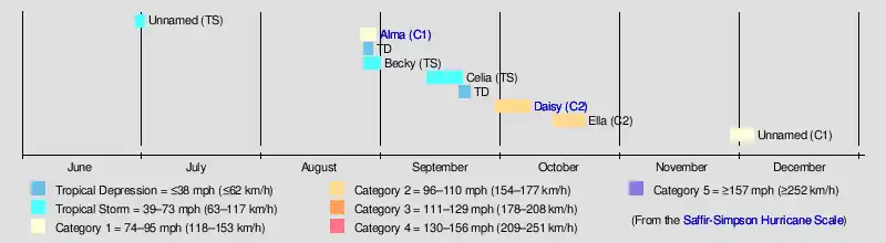 | Alma | August 26–30 | Category 1 hurricane | 85 (140) | 984 | Puerto Rico, Greater Antilles, The Bahamas, East Coast of the United States | $1 million | 0 (1) | |||