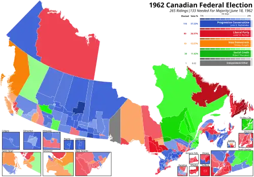 The 1962 Canadian federal election was held on June 18, 1962, to elect members of the House of Commons of Canada of the 25th Parliament of Canada. The governing Progressive Conservative (PC) Party won a plurality of seats in this election, and its majority government was reduced to a minority government.