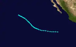On June 4, a tropical depression formed 585 miles (941 km) southwest of Acapulco, Mexico Early the next day, the depression system intensified into the first tropical storm of the season and was named Victoria. At that time, the storm was at its peak intensity of 50 mph (80 km/h) which it retained while moving the northwest. Early on June 7, the tropical storm weakened into a tropical depression before dissipating six hours later. [1] In all, Tropical Storm Victoria stayed at sea.