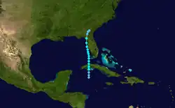 A strong tropical wave developed into a tropical depression in the northwestern Caribbean Sea on June 28.[12] The depression moved slowly northward and although it remained poorly defined throughout its duration,[5] the system intensified into a tropical storm early the following day.[12] Also despite being described as poorly defined, the wind field was well organized, especially in the northeastern quadrant. Around 14:00 UTC on June 29, the storm made landfall on Cuba's south coast just west of the modern-day border of Artemisa and Mayabeque provinces with winds of 40 mph (64 km/h). The cyclone emerged into the Straights of Florida several hours later. Early on June 30, the system peaked with sustained winds of 45 mph (72 km/h) and a minimum pressure of 1,004 mbar (29.6 inHg) while approaching the Florida Keys. Continuing northward, the storm passed just west of the Tampa Bay area on July 1 before striking Cedar Key at 22:00 UTC with winds of 45 mph (72 km/h). The system curved northeastward and weakened to a tropical depression over southern Georgia at 06:00 UTC on July 2, about 12 hours before dissipating.[12]