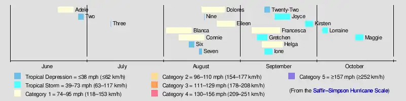 On August 7, a tropical storm was identified southwest of the Baja California Peninsula and named Connie. It continued westward until three days later when Connie began to move northwest while remaining a tropical storm. During the morning of August 12, the storm crossed into the Central Pacific. The next morning, Connie was deemed to have become a hurricane with winds of 85 miles per hour.[4] Connie was stable in intensity until the 15th when it weakened into a tropical storm while southeast of the Big Island of Hawaii. Connie dissipated while almost directly south of Kihei on Maui. Connie caused no reported damage or deaths in Hawaii.