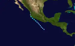 Six days after Joyce's dissipation, a tropical depression formed north of the Intertropical Convergence Zone on the evening of August 25.[8][9] The storm was then named Tropical Depression Sixteen-E. It took an extended amount of time, about three days before it intensified into a tropical storm.[10] The storm was designated as Tropical Storm Kirsten.[11]
