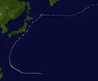 The incipient disturbance that became Super Typhoon Kit was first identified on June 20 near Chuuk State in the Federated States of Micronesia.[14] The JMA designated that system as a tropical depression that day as the system moved steadily westward.[15] The JTWC followed suit with this classification on June 22 following an investigation by reconnaissance. Early the next day, the depression acquired gale-force winds and was dubbed Tropical Storm Kit. Turning to the northwest, Kit developed a 35–55 km (22–34 mi) wide eye and reached typhoon status late on June 23.[14] Rapid intensification ensued late on June 24 into June 25; Kit's central pressure dropped 51 mbar (hPa; 1.5 inHg) in 18 hours from 965 mbar (hPa; 28.50 inHg) to 914 mbar (hPa; 26.99 inHg).[16] During this time, Kit's eye contracted to 13 to 17 km (8.1 to 10.6 mi).[14] At 06:00 UTC on June 26, the JMA estimated Kit's pressure to have abruptly dropped to 880 mbar (hPa; 25.99 inHg),[15] which would rank it among the top ten most intense tropical cyclones on record.[17] Around this time, the JTWC estimated Kit to have attained peak winds of 315 km/h (195 mph);[16][18] however, these winds are likely an overestimate.[1] A later reconnaissance mission on June 26 reported a pressure of 912 mbar (hPa; 26.93 inHg), the lowest observed in relation to the typhoon.[14] Weakening ensued thereafter as the system accelerated to the north-northeast. Retaining typhoon strength, Kit brushed southeastern Honshu, Japan, on June 28, passing roughly 155 km (96 mi) east of Tokyo. The system subsequently weakened to a tropical storm and transitioned into an extratropical cyclone south of Hokkaido on June 29.[16] The National Oceanic and Atmospheric Administration reported the remnants of Kit to have dissipated the following day near northeastern Hokkaido.[19] However, the JMA states that the system turned eastward and accelerated over the north Pacific before losing its identity on July 3 near the International Date Line.[15]