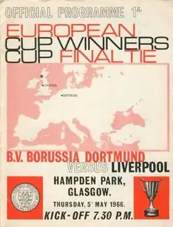 The 1966 European Cup Winners' Cup final was an association football match between Borussia Dortmund of West Germany and Liverpool of England played on 5 May 1966 at Hampden Park, Glasgow, Scotland. It was the final match of the 1965–66 season of Europe's secondary cup competition, the European Cup Winners' Cup. Both sides were competing in their first European final.