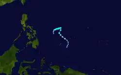 Therese emerged in the western Pacific on March 15 near the Caroline Islands as a tropical depression. Within 24 hours, it intensified into a tropical storm, moving steadily west-northwestward through the Philippine Sea. By March 18, Therese reached its peak intensity with sustained winds of 110 km/h (70 mph) and a central pressure of 990 hPa, classifying it as a "severe tropical storm" per the Japan Meteorological Agency (JMA).[2]