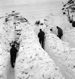 A rescue team from Czechoslovakia arrived with a dog trained to search for avalanche victims.[5] One of the Czech rescuers had been rescued from a similar avalanche by Polish Mountain Volunteer Search and Rescue members two years earlier.[6] The Czech team entered the Polish side under the responsibility of the commander of the Border Protection Forces post "Nad Śnieżką".[11] The first avalanche victims were located by the Czech dog. The rescuers followed, using probes, and then followed with shovels to dig through the areas marked by black flags. The extracted victims were first transported to a military tent and then to a morgue. Due to a lack of toboggans, the bodies were carried on skis tied together with a rope.[6]