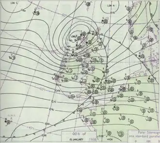 The origins of this violent storm appear to be from a cold front near Bermuda on 13 January 1968.[3] The system moved north of the Azores the next day and still appeared as a shallow low pressure area. In the next 24 hours, this low explosively deepened 50 millibars (1½ inches) to 956 mb (28.2 inHg) and passed over Central Scotland.[3][12] The storm continued to move over Northern Europe before dissipating on 18 January 1968.