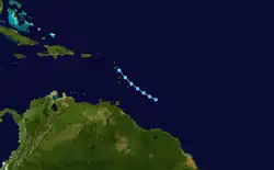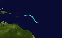 A tropical wave situated about 400 mi (640 km) east of Trinidad developed into a tropical depression on July 25.[12] The depression moved northwestward toward the Lesser Antilles and later that day crossed Barbados with winds of 35 mph (56 km/h). It continued to the northwest and may have struck Martinique on July 26. At 0000 UTC on the following day, the depression dissipated about 30 mi (48 km) west-southwest of Basseterre, Guadeloupe.[2]