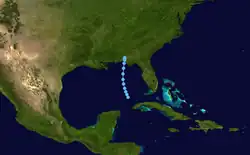 Ship reports on September 19 indicated the presence of low pressure area in the Gulf of Mexico, centered about 300 mi (480 km) west-northwest of Key West, Florida.[44] It is estimated that a tropical depression developed at 1200 UTC on that day. The depression headed north-northwestward and did not strengthen significantly, although it may have briefly become a tropical storm.[14][2] By early on September 21, the depression made landfall between Panama City and Port St. Joe, Florida.[44] It degenerated into a remnant low pressure area only a few hours later.[2] A high-pressure ridge blocked the system's movement, moving it to the east. By September 23, the system became a low pressure trough. Upper-level wind shear moved the circulation to the east-northeast and moved into the Atlantic Ocean the next day.[4]