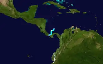 A tropical wave developed into a tropical depression near the Windward Islands on August 29.[2][4] Initially, the depression slowly strengthened while moving west-northwestward and was upgraded to Tropical Storm Francelia until more than 24 hours later. While located north of Honduras, it curved west-southwestward and was upgraded to a hurricane on September 1. Late on September 3, Francelia made landfall near Punta Gorda, Belize with winds of 100 mph (160 km/h). The storm quickly weakened inland, and less than 24 hours later, it dissipated over northern Guatemala.[2] However, the remnants of Francelia later contributed to the development of Hurricane Glenda in the eastern Pacific Ocean.[4]