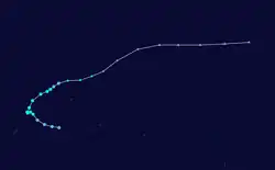 During January 8, the JMA started to monitor a tropical depression that had developed, about 500 km (310 mi) to the east of Ngerulmud, Palau.[3] Over the next day the system gradually developed further as it moved north-westwards, before it was classified as a tropical storm and named Sarah by the JTWC, after a US Navy plane had found an organised system.[3][4] The system subsequently recurved north-eastwards, before it was classified as a Severe Tropical Storm by the JMA during January 10.[5] During that day, the JTWC reported that the system had peaked, with 1-minute sustained wind-speeds of 95 km/h (60 mph).[4] Over the next day, the system quickly weakened and became an extratropical cyclone during January 11.[4] Sarah's extratropical remnants were subsequently tracked as they moved north-eastwards, until it made landfall on Canada and broke up over the mountains of British Columbia during January 17.[4]
