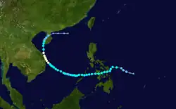 On April 23 Tropical Storm Wanda began its life to the east of the Philippines. It tracked over the archipelago, and emerged into the South China Sea on the 25th. It turned to the northwest, and became a typhoon on May 1 just off the coast of South Vietnam. The westerlies brought Wanda to the north and northeast, where it weakened until dissipating on the 4th near Hainan Island.