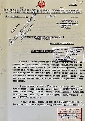![]() Ukrainian KGB resolution signed by Petro Shelest confirming the start of Operation Bloc, 13 January 1972 | |