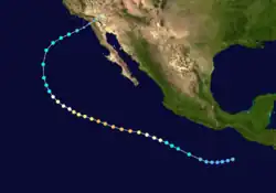 A westward-moving area of squalls south of Mexico organized into a tropical depression on September 30. It then strengthened into a tropical storm and was named Joanne. Joanne moved west northwest, and intensified into a hurricane on October 1. It then peaked as a Category 2 hurricane on October 2. Joanne then slowed down and began to recurve, first to the north, and then the north northeast. While accelerating in that direction, Joanne made landfall near Laguna Chapala on the Baja California Peninsula as a tropical storm.[4] Joanne managed to retain a closed circulation and bring tropical storm force winds to Arizona, the first recorded time that had happened.[10] The tropical storm dissipated inland over Sonora on October 7.[4] Joanne is one of only four known Pacific hurricanes to bring gale-force winds to the Continental United States, and was the first since the 1939 California tropical storm.[11]