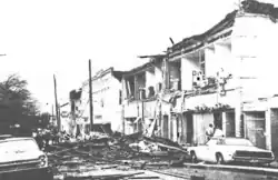 The tornado struck Decatur without warning around 2:45 p.m. CST. A severe thunderstorm warning was issued at 2:43 p.m., tornado sirens were sounded at 2:48 p.m., and a tornado warning wasn't issued until 2:56 p.m. by which time the tornado had cleared Decatur and dissipated near US 51.[28][23] Local police established two command posts and dispatched officers, including off duty and auxiliary, to Decatur for patrol duties. Fifteen firefighters were deployed to check for fires and assist with downed wires while the street division assisted with debris removal. Representative Edward Rell Madigan (R-IL) pledged all possible assistance to victims.[28] Electrical service was restored to the city by 8:00 a.m. on April 4, with the exception of 35 homes. Cablevision service remained offline due to damaged wires.[34] The American Red Cross set up a relief headquarters at Boling Springs Church of God with two coordinators assisting victims with federal assistance paperwork. A canteen operated by the Salvation Army provided food and Catholic Charities distributed clothing. The Council of Community Services was likely to head long-term relief efforts.[35] All roads in the city were cleared by April 5. The tornado prompted the addition of additional procedures to an in-the-works emergency preparedness program which would now include the Inspection and Public Works Department. Faster emergency medical response was identified as a pressing issue and plans to have a mobile headquarters were made.[36] The Macon County Fairgrounds president sought state aid to repair the facility.[31]