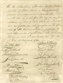 commissions on stock trades, an event that became known as “May Day.” This deregulation ended 183 years of non-negotiable commissions on the New York Stock Exchange (NYSE).[1][2] Until then, the NYSE had a fixed commission schedule, which all member firms were required to follow charging the same minimum fee (1%–2% of the trade's value) depending on the size of the trade, a practice dating back to the 1792 Buttonwood Agreement.[3]