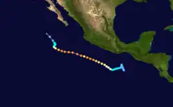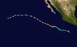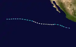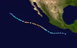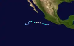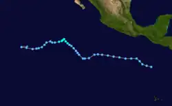 A tropical disturbance was first noted about 345 miles (555 km) south of the Guatemalan coastline on September 27.[2] It organized into Tropical Storm Madeline by 00:00 UTC on September 29 but failed to further develop, instead weakening to a tropical depression the next morning. By 00:00 UTC on October 4, Madeline re-intensified into a tropical storm, beginning a gradual curve toward the north as well. The system continued to strengthen and became a hurricane early on October 6; by 06:00 UTC on October 8, Madline peaked as a Category 4 hurricane with winds of 145 mph (233 km/h). It moved onshore the coastline of Mexico a few hours later, rapidly weakening and losing its status as a tropical cyclone after 18:00 UTC that day.[3]