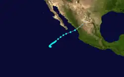The deadliest and most destructive hurricane of the 1976 season originated as a large tropical disturbance about 525 miles (845 km) southwest of Acapulco, Guerrero, on September 25.[2] It developed into a tropical depression around 18:00 UTC that day and steadily strengthened into Tropical Storm Liza 24 hours later.[3] The incipient cyclone turned toward the north while continuing over warm waters,[2] and it attained hurricane strength by 00:00 UTC on September 28. Liza intensified into a major hurricane on September 29,[3] and a reconnaissance aircraft measured peak winds of 140 mph (230 km/h) around 18:00 UTC, when the storm was in the midst of an eyewall replacement cycle.[2] Liza maintained Category 4 intensity until early on October 1 when it moved ashore the coastline of Mexico north of Los Mochis, Sinaloa, as a slighter weaker Category 3 cyclone. Liza rapidly weakened over the mountainous terrain and was last tracked as a tropical cyclone at 12:00 UTC on October 1.[2][3]