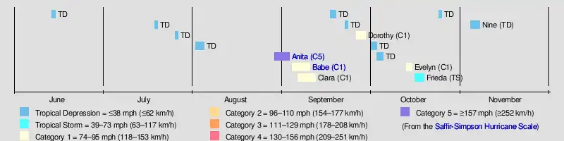 Tropical cyclogenesis in the 1977 Atlantic hurricane season began with the development of a tropical depression on June 13. Activity briefly halted, until two other tropical depressions developed in the second half of July. A fourth tropical depression formed in early August.[3] Later that month, Hurricane Anita developed on August 29. It was the latest in the season for a first named storm to form in the satellite era.[9] September, the climatological peak of hurricane season, was its most active month.[7] Five tropical cyclones developed, including two tropical depressions,[3] and hurricanes Babe, Clara, and Dorothy.[7] There were also five tropical cyclones in October – three tropical depressions,[3] Hurricane Evelyn, and Tropical Storm Frieda.[7] The final tropical cyclone of the season, Tropical Depression Nine, developed between the Greater Antilles and Bermuda on November 3 and dissipated by November 7.[3]