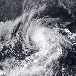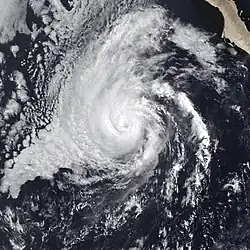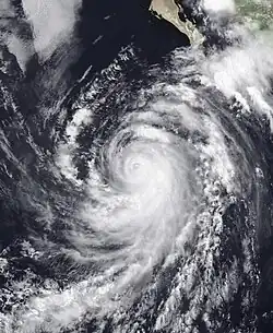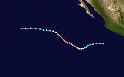 Two areas of disturbed weather focused south of the Gulf of Tehuantepec on October 1, one of which with origins as a tropical wave, underwent binary interaction and merged into one larger system the next day.[5] The disturbance was upgraded to a tropical depression around 18:00 UTC, and it further intensified into Tropical Storm Rosa by 00:00 UTC on October 3.[6] Rosa moved around the western periphery of an upper-level ridge,[5] strengthening over warm waters as it did so. The cyclone became a hurricane by 00:00 UTC on October 4, ultimately attaining peak winds of 85 mph (137 km/h) on October 4.[6] An aircraft reconnaissance plane intercepted the storm around this time, finding a 35 mi (56 km) elliptical eye open to the southwest.[5] Rosa moved northwest over colder waters, transitioning to an extratropical cyclone around 06:00 UTC on October 7 and ultimately dissipating west of Baja California after twelve hours.[5][6]