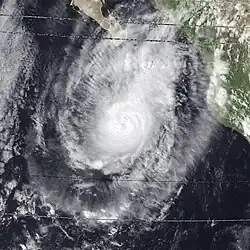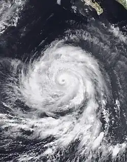 On August 29, a tropical wave and attendant disturbance were located southwest of Acapulco.[4][5] The system organized into a tropical depression by 18:00 UTC on August 30, and it became Tropical Storm Norman six hours later. Norman moved west-northwest while gaining strength,[6] intensifying into a hurricane around 06:00 UTC on September 1 and developing a small eye shortly thereafter. The hurricane rapidly intensified over warm waters,[5] catapulting to Category 4 intensity by 06:00 UTC on September 2. Norman peaked with winds of 140 mph (230 km/h) twelve hours later, equaling Fico and Hector as the strongest storm of the 1978 season.[6] A reconnaissance aircraft in the cyclone at this time observed a 45 mi (72 km) diameter eye.[5] High pressure steering the storm west-northwest gave way to strong southwesterly flow aloft, causing the storm to recurve northeast in a much less favorable environment. Subsequent recon missions found a much weakened cyclone,[5] and Norman ultimately dissipated south of San Clemente Island after 00:00 UTC on September 7.[6]