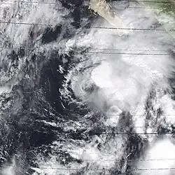 The Atlantic's Hurricane Greta struck Central America and maintained its status as a tropical cyclone while crossing into the East Pacific. It emerged into the Gulf of Tehuantepec as a tropical depression but soon gained strength over warm waters; since it entered a new basin, the depression was reclassified as Tropical Storm Olivia. The cyclone moved erratically after this point while continuing to intensify,[5] becoming a hurricane and attaining peak winds of 75 mph (121 km/h) by 00:00 UTC on September 22.[6] Olivia eventually tracked north-northeast, moving onshore about 60 mi (97 km) east of Salina Cruz between 19:00–20:00 UTC that day;[5] the system maintained winds of 60 mph (97 km/h) at that time. Rapid weakening occurred thereafter, and Olivia dissipated after 00:00 UTC on September 23.[6]