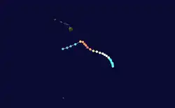 An area of disturbed weather within the ITCZ developed into Tropical Storm Susan around 00:00 UTC on October 18.[7] The storm intensified over subsequent days, becoming a hurricane around 00:00 UTC on October 20 and further developing into a major hurricane by 18:00 UTC the next day. Susan attained Category 4 strength with winds of 130 mph (210 km/h) six hours later,[6] one of the strongest on record in the Central Pacific at that time. Although the powerful hurricane initially tracked northwest toward Hawaii, it sharply veered toward the southwest while succumbing to strong wind shear.[7] Susan weakened rapidly, with winds falling from 115 to 35 mph (185 to 56 km/h) within 24 hours, and dissipated after 00:00 UTC on October 24.[6]