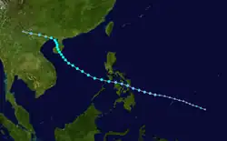 In the South China Sea, Herbert tracked northwestward toward Hainan Island while intensifying slowly.[17] After exiting the PAR on 25 June, PAGASA stopped tracking the system.[3] Later that day, both agencies stated that Herbert peaked with sustained winds of 50 kn (60 mph; 95 km/h).[17][7] Slightly weakening, at 1800Z the next day, Herbert made its landfall in Hainan with maximum sustained winds of 45 kn (50 mph; 85 km/h).[17] After tracking into the Gulf of Tonkin, on 28 June, Herbert made its second landfall south of Jinzhou, China with sustained winds of 45 kn (50 mph; 85 km/h).[17] Rapidly weakening, both the JTWC and JMA stopped tracking Herbert the next day.[17][7]