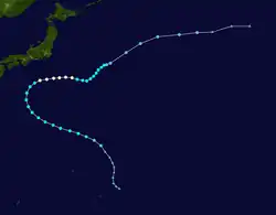 On 24 July, a tropical disturbance which had recently spawned from a tropical upper tropospheric trough (TUTT) began developing.[31] Steadily tracking westward, two days later, the JMA designated the system as a tropical depression.[7] A few hours later, the JTWC issued a TCFA on the system as it steadily developed.[31] As the depression's satellite signature improved, the JTWC issued their first warning on it early the next day.[31] Twelve hours later, both the JTWC and JMA upgraded the system into a tropical storm, with the former agency naming it Lex.[7][31] Tracking northwestward and steadily intensifying, on July 31, both agencies upgraded Lex into a typhoon.[7][31] Soon after, Lex executed a cyclonic loop, later peaking with 1-minute sustained winds of 90 mph; 150 km/h (80 kn)[31] and 10-minute sustained winds of 85 mph; 140 km/h (75 kn) according to the JMA.[7] However, soon after, cold air from a deep surface low caused Lex to steadily weaken.[31] As a result, on 7 August, Lex transitioned into an extratropical low according to the JTWC.[31] The JMA kept monitoring Lex until 13 August.[7]