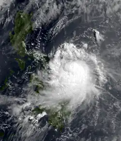 In mid-June, an equatorial trough was active, stretching from the Philippines to the eastern Caroline Islands near the equator. On 20 June, satellite imagery indicated increased convective activity around the eastern periphery of the trough as a result of convergent easterly flow. As a result, a TCFA was issued on the area of convective activity.[17] The next day, the disturbance was designated a depression by PAGASA, who named it Huaning.[3] Making landfall in Leyte, Philippines the next day,[17] the JMA designated the system as a tropical depression.[7] However, landfall prevented further development, causing the TCFA to be cancelled later that day.[17] However, after tracking westwards for several days, on 24 June, the JTWC reissued a TCFA. Several hours later, both the JTWC and JMA designated Huaning as a tropical storm,[17][7] with the former agency naming it Herbert.[17]