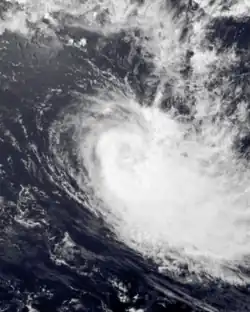 During March 27, the FMS started to monitor a depression that had developed, within a trough of low pressure about 235 km (145 mi) to the northeast of Penrhyn in the Northern Cook Islands.[23][24] Over the next couple of days, the system moved south-westwards and passed about 140 km (85 mi) to the southeast of Penhryn, as it gradually developed into a tropical cyclone.[23][24] The depression was subsequently named Tomasi by the FMS during March 29, after it had developed into a Category 1 tropical cyclone on the Australian scale.[23] After the system was named, Tomasi went through a period of rapid intensification, with an eye appearing on visible satellite imagery during that day.[23] It was also classified as a Category 3 severe tropical cyclone, before a tropical cyclone alert was issued by the FMS for Niue at around 23:08 UTC (11:08 FST, March 30).[23]