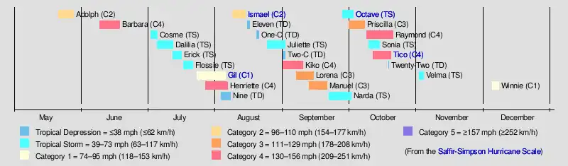The first storm of the season, Hurricane Adolph, became the southernmost-forming east Pacific tropical cyclone on record after forming at a latitude of 7.1°N. After a slow start, activity picked up in July, when Hurricane Gil moved through the Hawaiian Islands, resulting in minor damage. In early August, Hurricane Ismael was responsible for three deaths and $19 million (1983 USD) in damage in the United States. In September, hurricanes Kiko and Lorena brought significant damage and seven deaths to southern Mexico. About a month later, Tropical Storm Octave became the worst tropical cyclone on record to affect Arizona. Octave killed 15 people, and caused $500 million in damage to Arizona and $12.5 million to New Mexico. Later in October, Hurricane Tico was a very intense hurricane at the time of its landfall and thus left 25,000 homeless. Damage throughout the country was estimated at $200 million while 135 deaths were reported in Mexico. Although most of its impact occurred in Mexico, Tico's remnants brought significant flooding in the Central United States, resulting in six deaths and $42 million in damage. A few days later, Hurricane Raymond posed a threat to Hawaii, but did little actual damage. The final storm of the season, Hurricane Winnie, was a rare December cyclone.