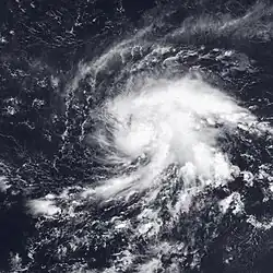 Tropical Storm Juliette originated from a tropical depression that first formed on August 24 130 mi (210 km) east-northeast of Clipperton Island. Moving west-northwest and briefly west, the depression gradually intensified. The system then turned northwest around a ridge off the west coast of Baja California Sur. At 1800 UTC on August 26, the EPHC announced that the depression had strengthened into a tropical storm. Moving toward a strong trough off the west coast of the peninsula, Juliette reached its peak intensity as a mid-level tropical storm early on August 29, with winds of 60 mph (95 km/h). Upon attaining peak intensity, Juliette developed an eye. However, Juliette began to weaken over cooler water. Meanwhile, the trough weakened and Tropical Storm Juliette headed west. On August 30, the EPHC remarked that Juliette was downgraded into a depression. Two days later, Tropical Depression Juliette had dissipated over cold water.[7]