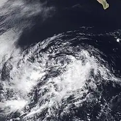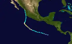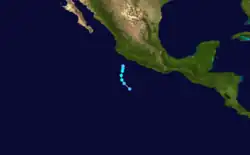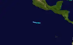 On July 30 and 31, a tropical disturbance crossed Central America. At a low latitude, a tropical depression was declared on August 3.[7] At first, the storm was expected to turn west-northwest,[17] but it continued west instead.[7] Nine-E failed to intensify despite being situated over warm water. The depression dissipated on August 7 later over somewhat cooler water.[7]
