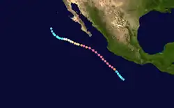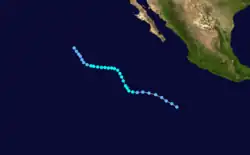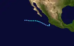 During the 1983 season, a total of 21 named storms formed,[3] which was well-above the long-term average of 15.[4] However, this total was slightly less active than the 1982 Pacific hurricane season, which saw a then-record 22 storms form.[5][6] However, 1983 was at that time the most active season in the Eastern Pacific Hurricane Center (EPHC) warning zone,[7] but this record itself was surpassed during the 1985 Pacific hurricane season,[8] and again in the 1992 Pacific hurricane season.[9] Additionally, 12 storms reached hurricane intensity, which was above the average of eight.[7] Of the 12 hurricanes, eight attained Category 3 intensity or higher on the SSHWS.[4] The season started on May 21 with the formation of Adolph and ended on December 9, with the dissipation of Hurricane Winnie. Lasting 201 days, 1983 was the longest season on record. There were a total of 1,238 storm hours, which was the most in four years.[7] Despite the activity in the EPHC's warning responsibility, only two storms formed in the Central Pacific Hurricane Center (CPHC)'s area of responsibility, both of which stayed depressions.[10] A moderate El Niño was present throughout the season, with water temperatures across the equatorial Central Pacific was nearly 5 °F (0.6 °C) above normal.[11] The Pacific decadal oscillation (PDO) was in a warm phase during this time period.[12] Both of these factors are known to enhance Pacific hurricane season activity. Furthermore, 1983 was in the middle of an era where all but the 1988 Pacific hurricane season was near or above average.[13]