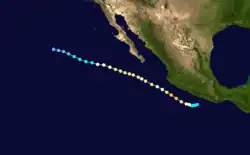 The eleventh cyclone of the 1983 season formed from an intense area of thunderstorms located over the Yucatán Peninsula on August 11 and 12. After crossing the Mexican mainland, it emerged into the Pacific basin near Guadalajara early on August 13. After turning northwest, it intensified into a depression two days later after showing sign of a circulation. The depression continued northwest with little change in wind speed, and on August 16, about 24 hours after formation, the depression dissipated after its circulation ceased very close to landfall on the Baja California peninsula.[7]